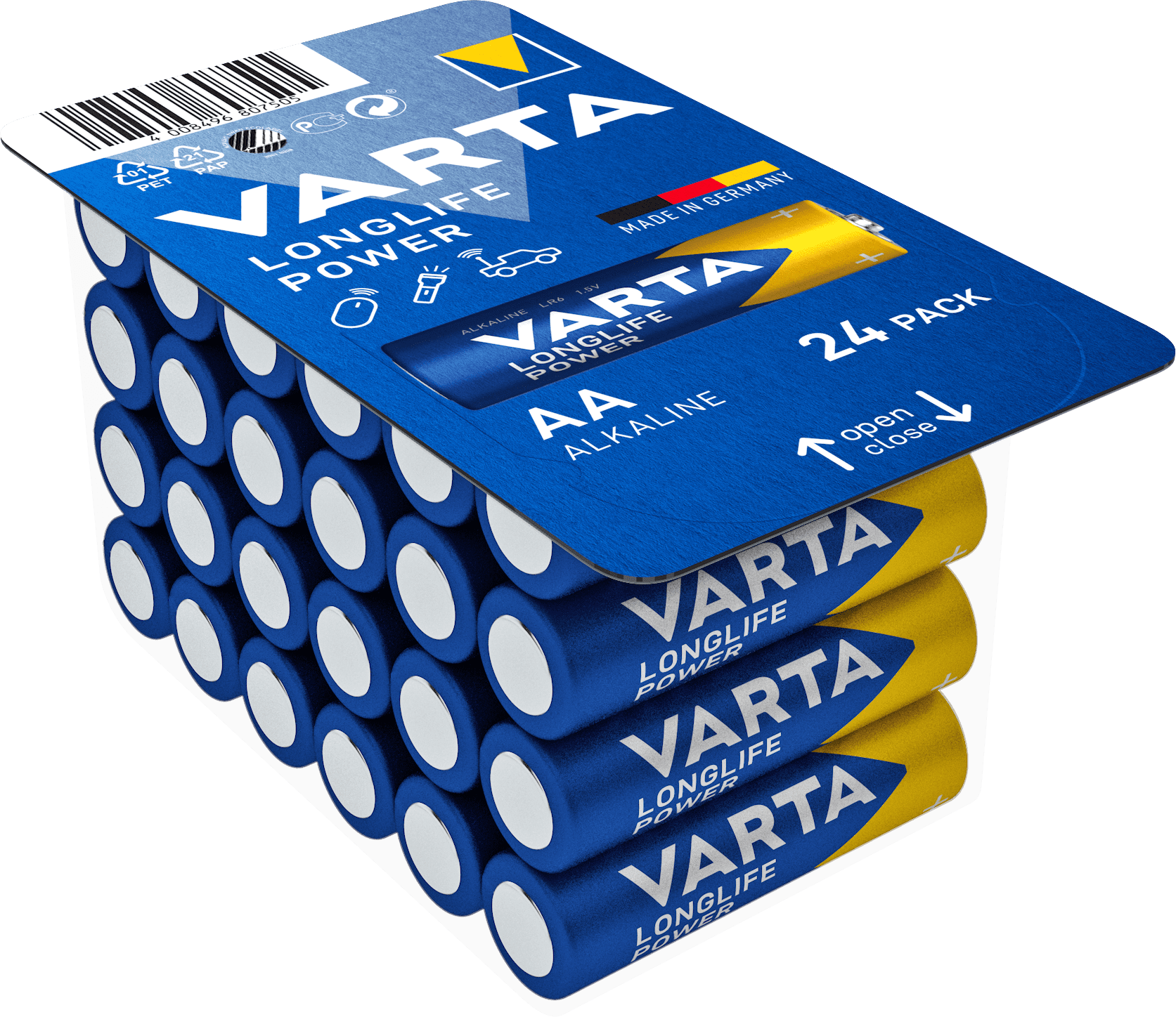 Alkalne baterije za enkratno uporabo so zasnovane za naprave, ki potrebujejo prilagodljiv dotok natančnih količin energije. Varta 4906301124 Longlife Power 24 AA (Big Box) baterije, 24 z napetostjo 1,5 V so idealne za igrače, dodatke za računalnik ali svetilke. 24 baterij v pakiranju. Izdelano v Nemčiji. Celoten opis