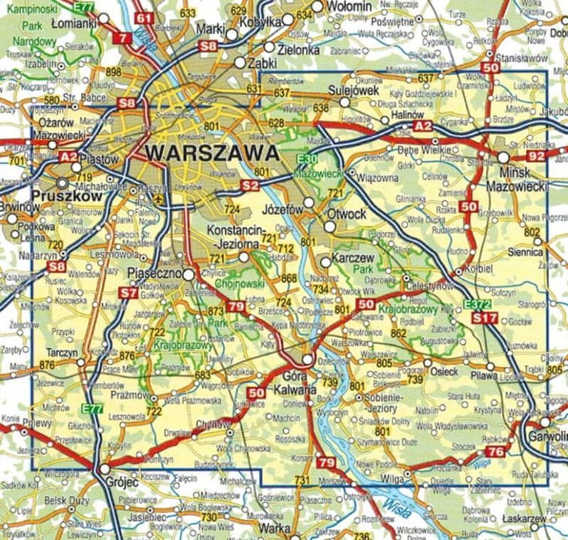 Zložljiv, dvostranski turistični zemljevid južnega območja Varšave v merilu 1 : 50.000, ki ga je izdala založba Compass.