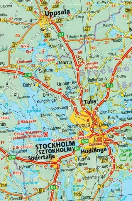 Zložljiv, dvostranski zemljevid Švedske v merilu 1 : 875.000. Legenda v poljščini in angleščini.