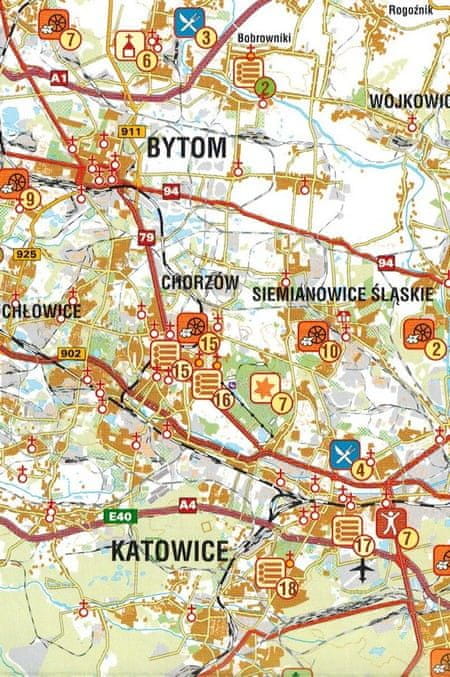 Zložljiv zemljevid mesta Świętochłowice v merilu 1:9.000 s seznamom ulic, posodobljenim na terenu. Zemljevid med drugim prikazuje vrste cestnih površin, šole in hišne številke. Načrt zajema upravne meje mesta. Na drugi strani je zemljevid tematskih poti šlezijske aglomeracije v merilu 1:200.000 s seznamom znamenitosti.