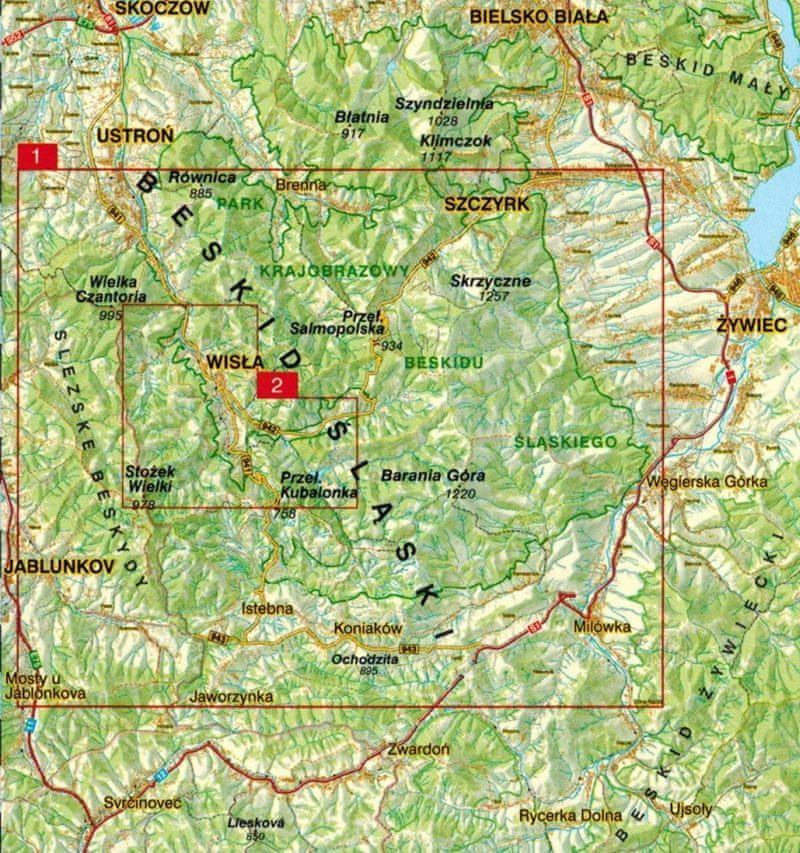 Na eni strani lista je zemljevid območja Visle v merilu 1:50.000 z označenimi lokalnimi potmi, smučarskimi progami, kolesarskimi stezami in potmi za jahanje. Meje zemljevida segajo od Ustrońa in Szczyrka na severu do Jaworzynke in Dolne Rajcze na jugu, Bystrzyce (Češka) na zahodu ter Węgierske Górke in Milówke na vzhodu.