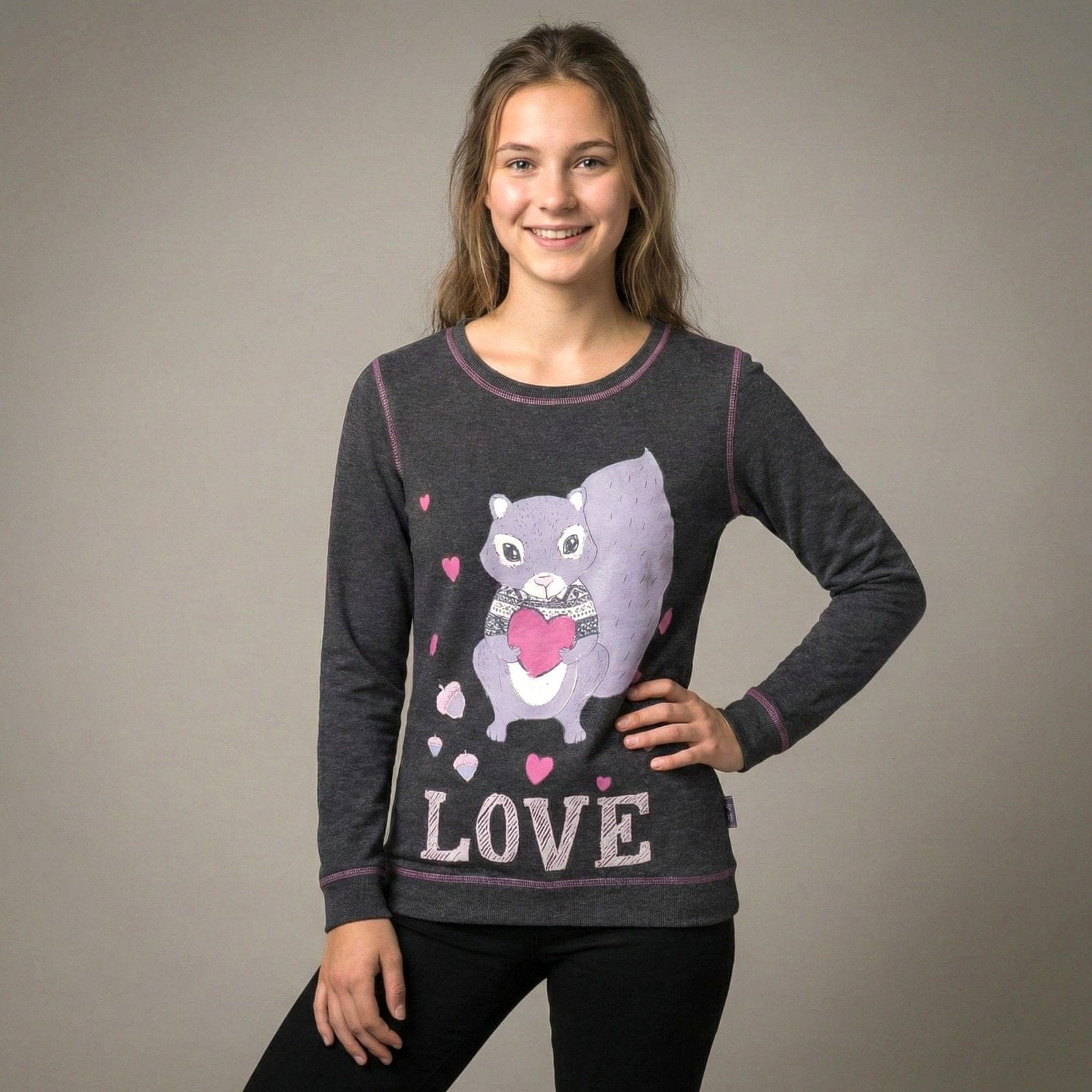 Nežen potisk, ki prikazuje veverico, ki drži srce, in napis „LOVE“ dajeta bluzi topel, dekliški značaj.