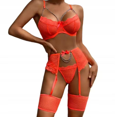 shumee Čudovit ženski komplet spodnjega perila: modrček, tangice, podvezice, pasovi, oranžen, velikost M