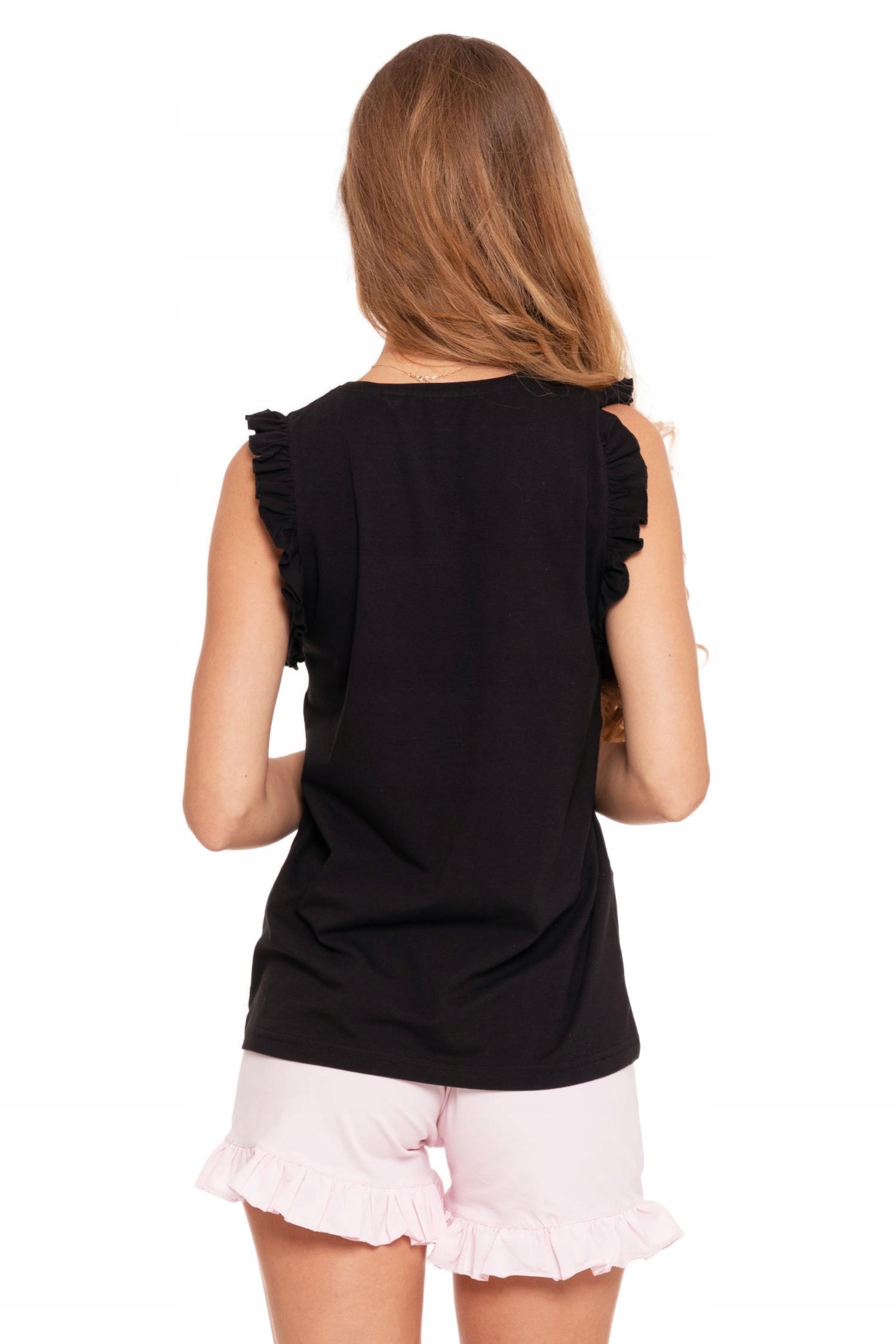 Črna pižama brez rokavov doda eleganco pižami in poudari nežen izrez. Poleg tega volančki dajejo vrhu dekliški čar in ustvarjajo presenetljiv detajl. Roza kratke hlače