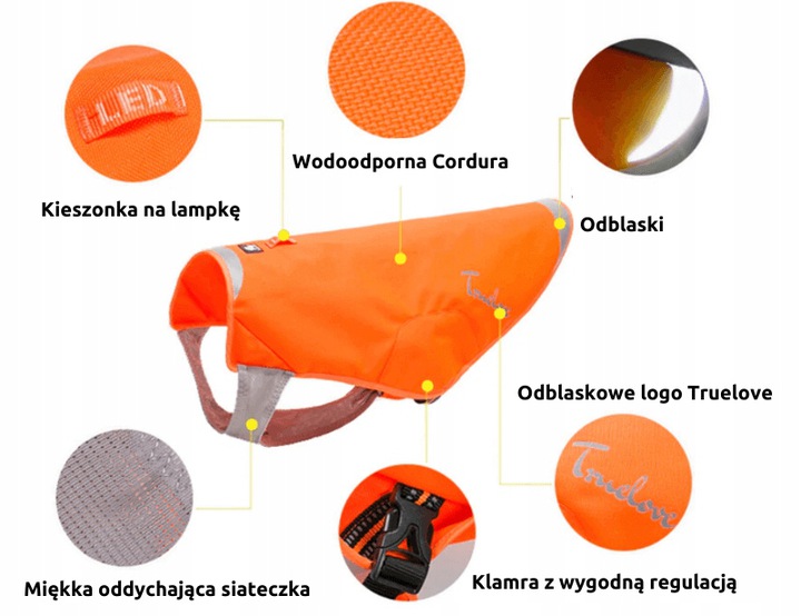 Odsevni jopič Truelove je obvezen kos opreme za vsakega aktivnega psa. Njegove opozorilne barve in odsevne črte bodo znatno izboljšale vidljivost vašega psa v slabem vremenu ali slabih svetlobnih pogojih. Ta izdelek je še posebej priporočljiv za lovske pse, pse sledilce in pse, ki delajo v težkih terenskih razmerah, na primer v gozdu. Ta deževni jopič