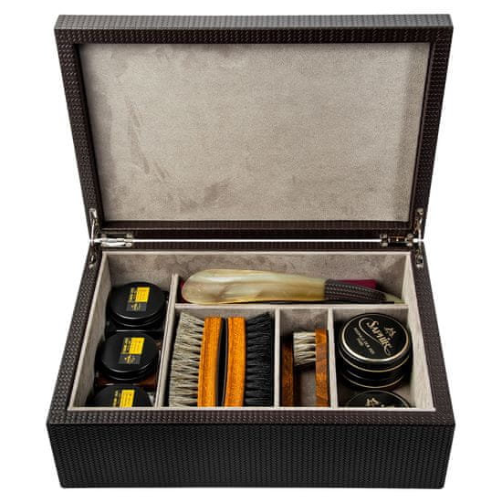 Lesena škatla, obložena z usnjem Firenze, ki je rahlo odporna na vodo in praske, vsebuje komplet za čiščenje čevljev: 3× čebelji vosek 50 ml, 3× krema 75 ml, 2× krpo za poliranje, žličko za rog, 4× krtačo iz konjske žime za nanašanje kreme in poliranje. Celoten opis