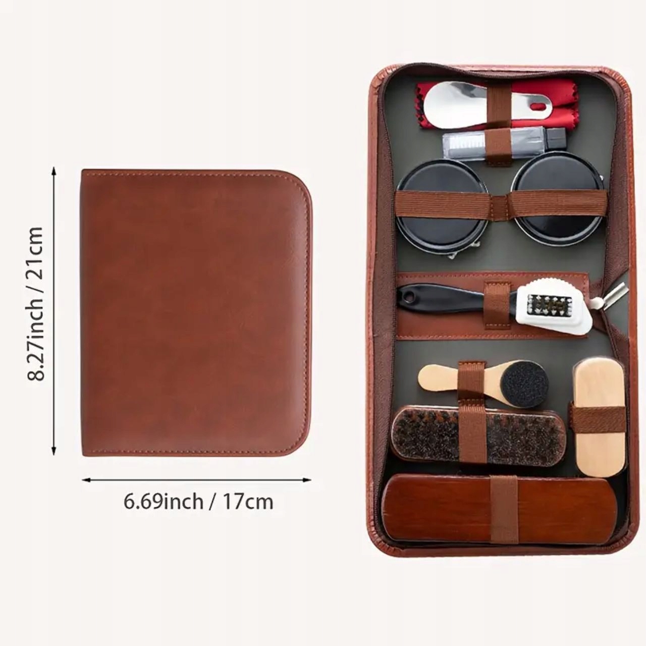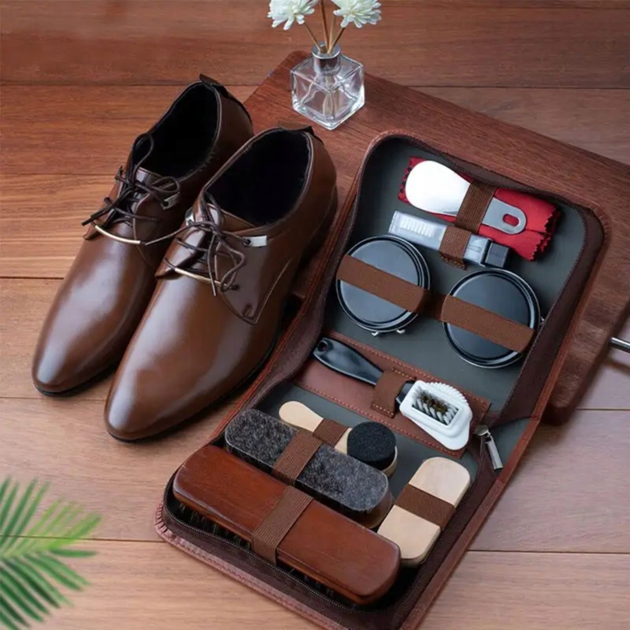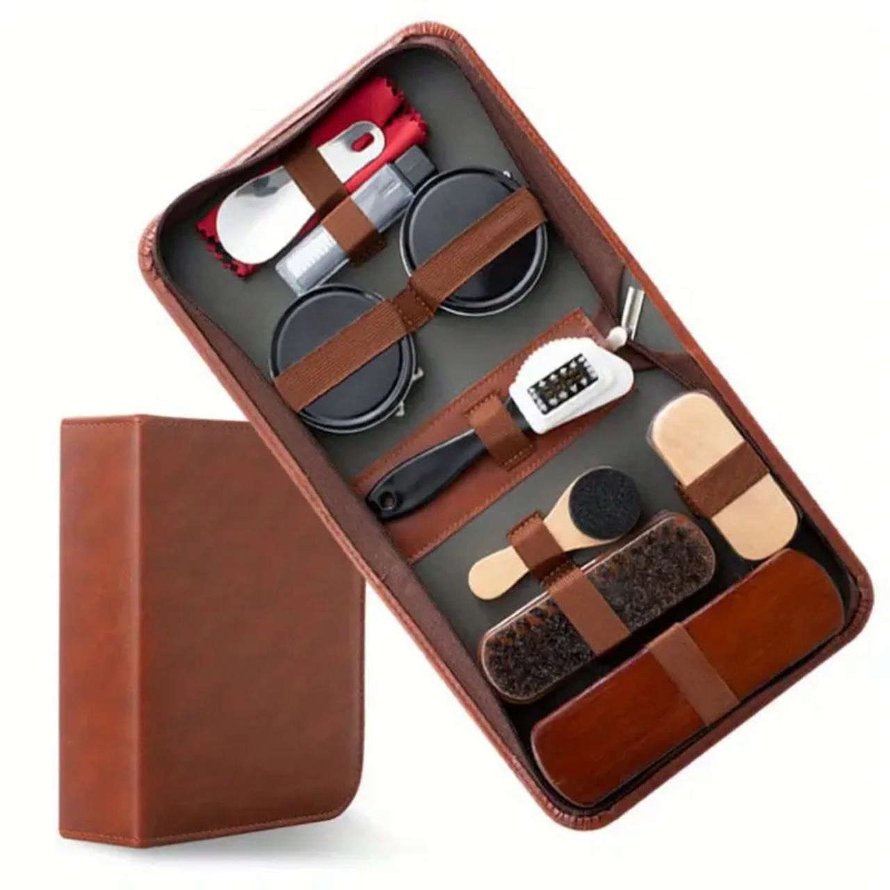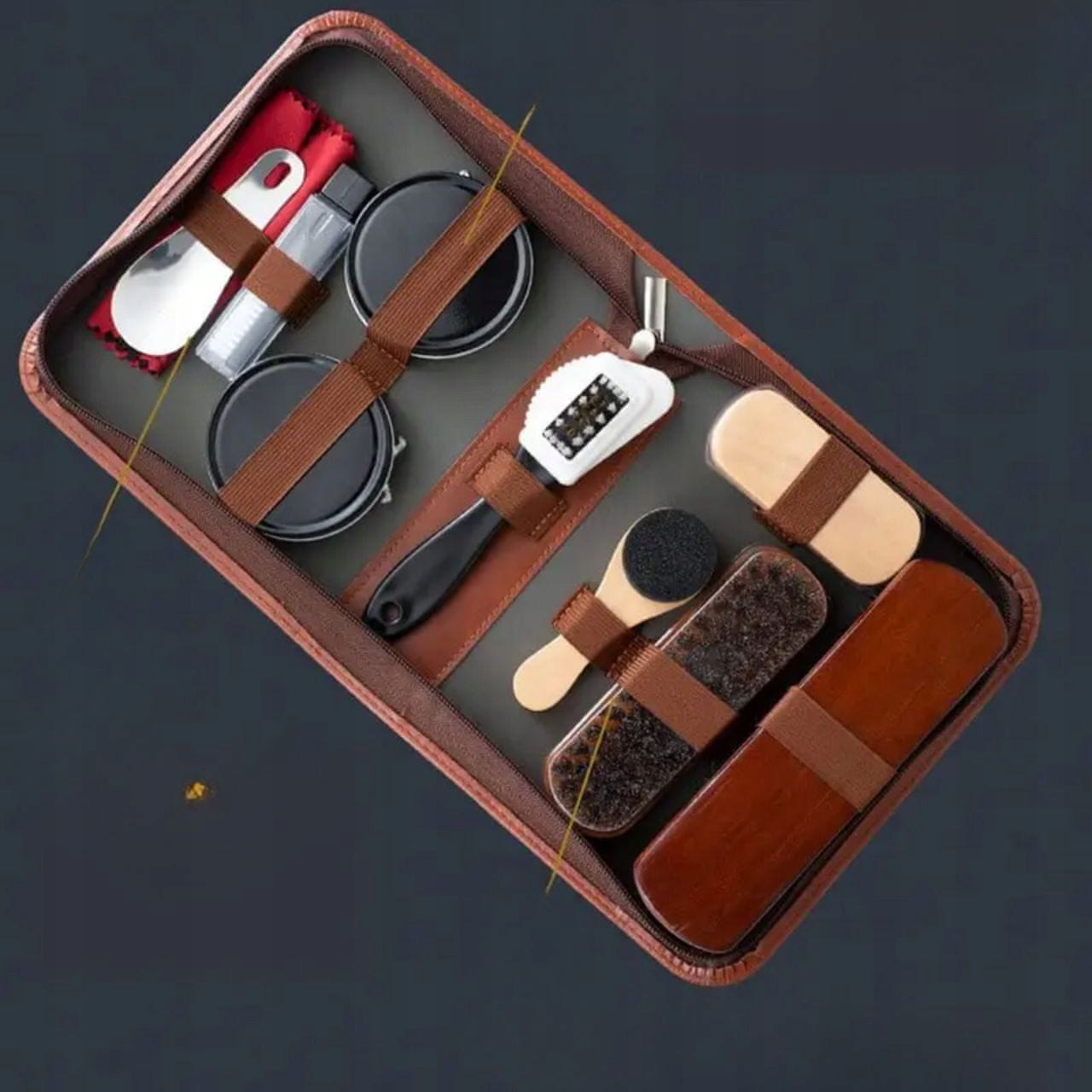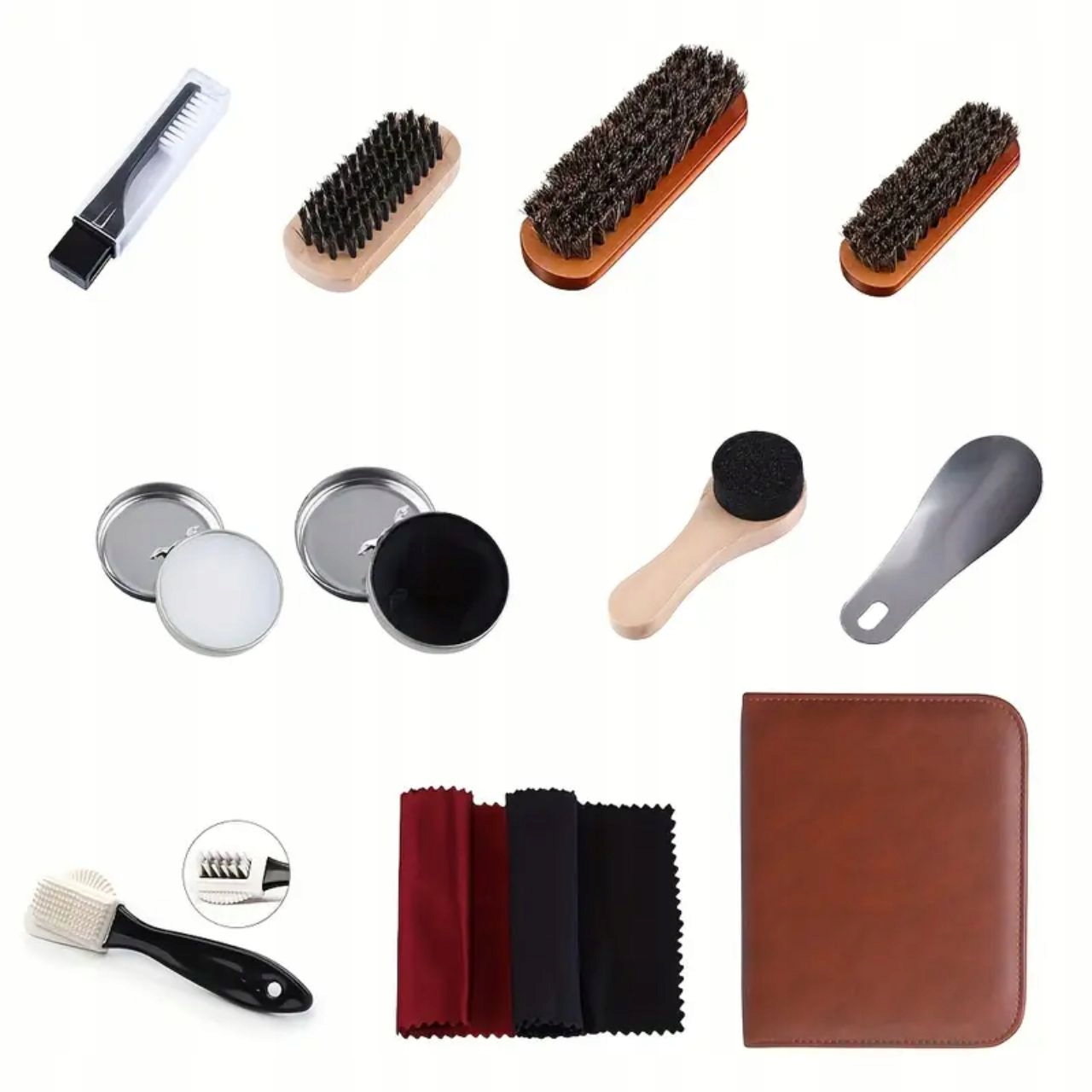 Komplet vsebuje11 orodja in pripomočkiza čiščenje, poliranje in vzdrževanje vaših čevljev. V kompletu so različni čopiči, aplikatorji, loščila in krpe, da bodo vaši čevlji videti kot novi.