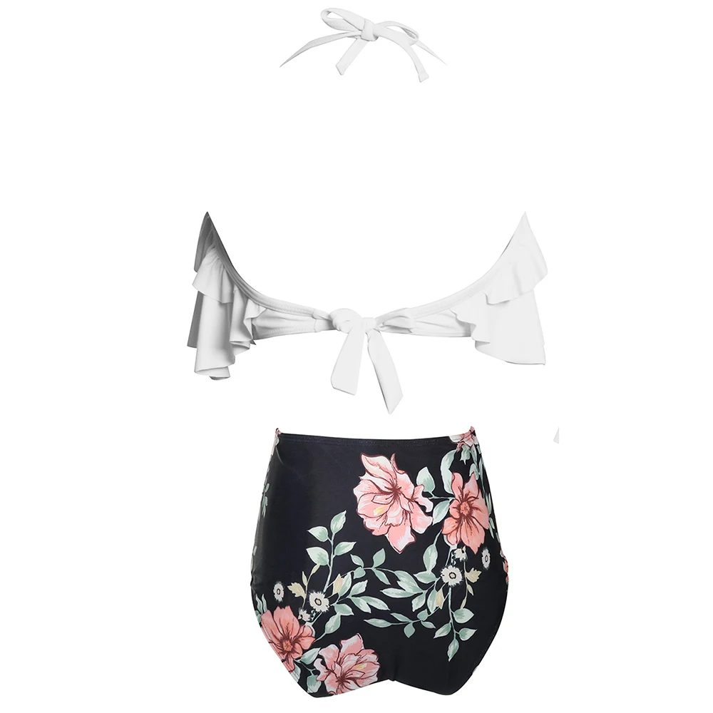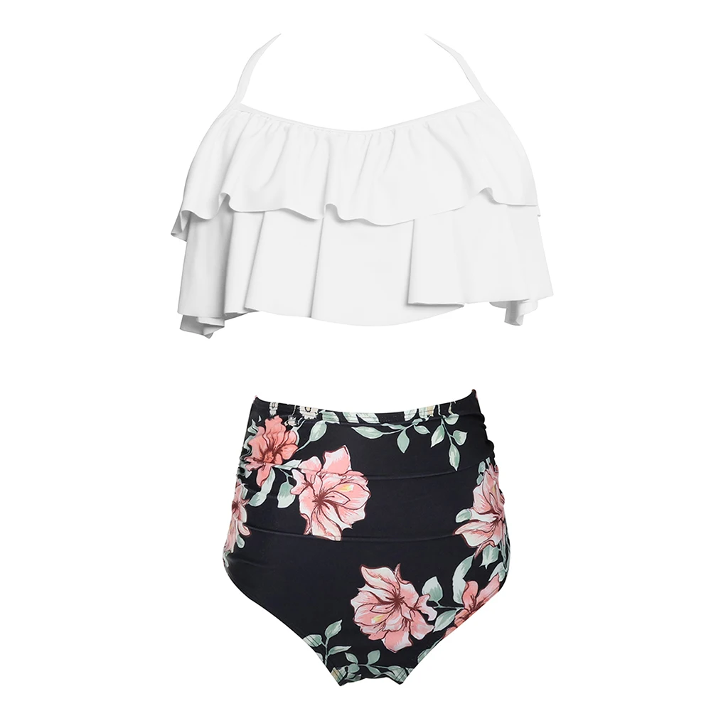 shumee Bikini kopalke z visokim pasom in naborki, bele, črne, XL Bikini kopalke z visokim pasom in naborki, bele, črne, XL