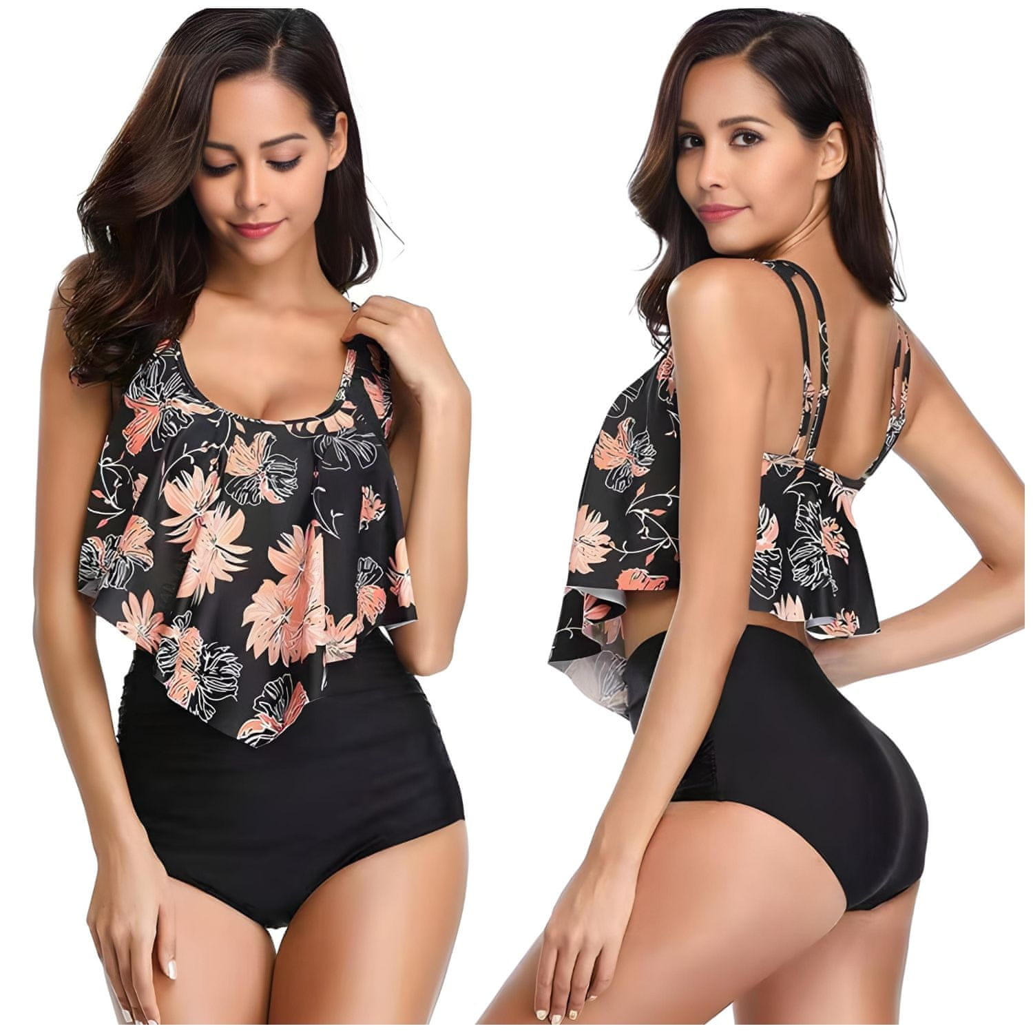 shumee Bikini kopalke z visokim pasom in potiskom listov, črne barve, za na plažo, bikini kopalke z visokim pasom in potiskom listov, črne barve, za na plažo