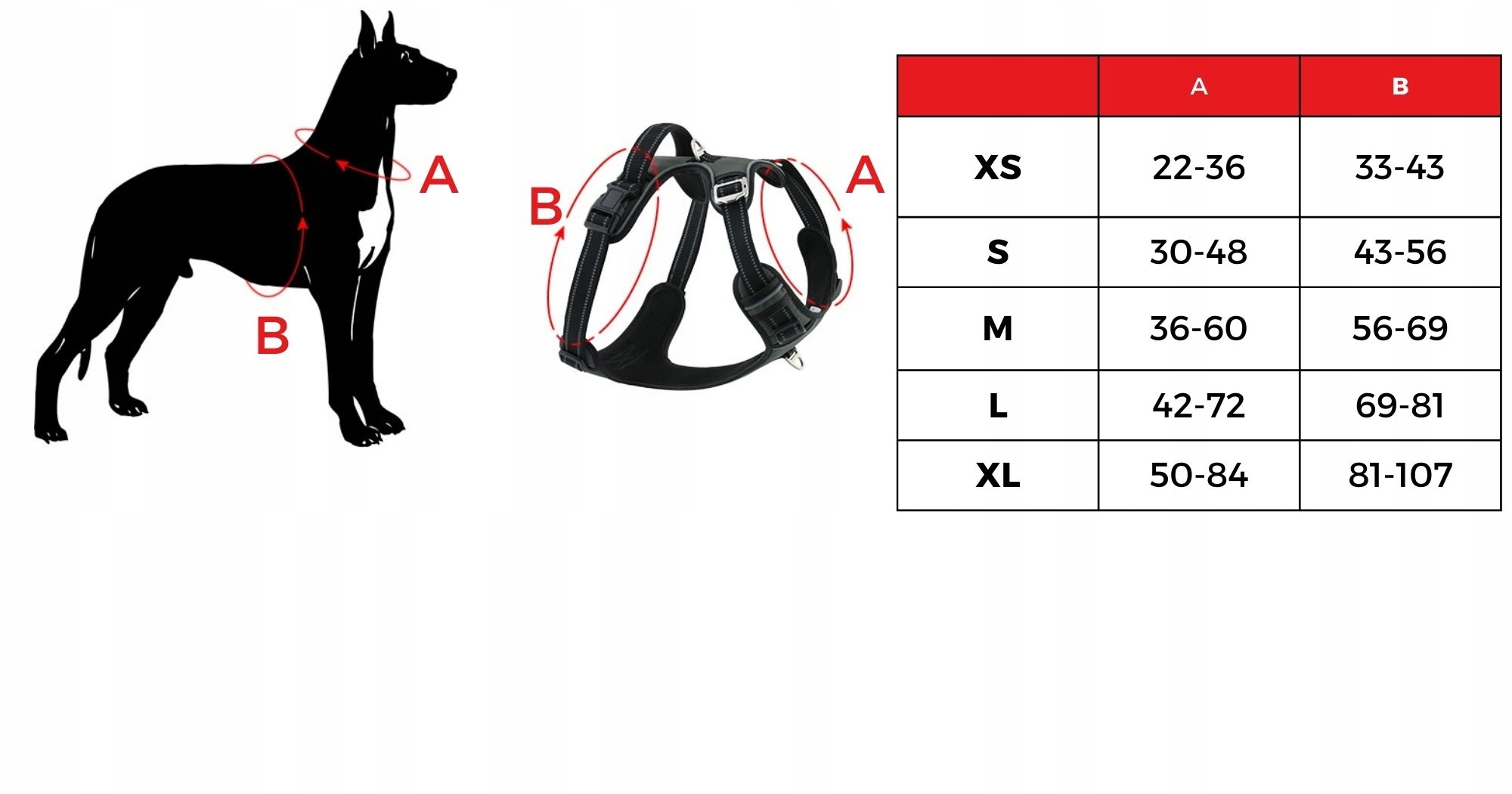- Velikost XL: Popolno za večje pasme, kot so zlati prinašalec, doberman, rotvajler, labradorec, nemški ovčar ali boksar. Dimenzije so obseg prsnega koša 81–107 cm in obseg vratu 50–84 cm. Priporočljivo za pse, težke do 40 kg.