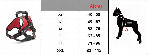 Za izbiro oprsnice izmerite obseg svojega psa na mestu, prikazanem na zgornji risbi, in izberite ustrezno velikost glede na opisano območje.