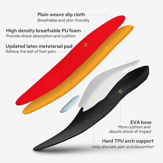 • LOK VLOŽKI ZA PLOŠKA STOPALCA:Ti vložki so zasnovani za normalno podporo stopalnega loka in so primerni za večino ljudi. Podpora za lok porazdeli pritisk ter izboljša ravnotežje in stabilnost.