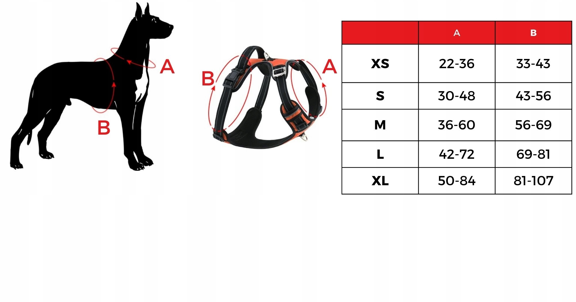 - Velikost XL: Popolno za večje pasme, kot so zlati prinašalec, doberman, rotvajler, labradorec, nemški ovčar ali boksar. Dimenzije so obseg prsnega koša 81–107 cm in obseg vratu 50–84 cm. Priporočljivo za pse, težke do 40 kg.
