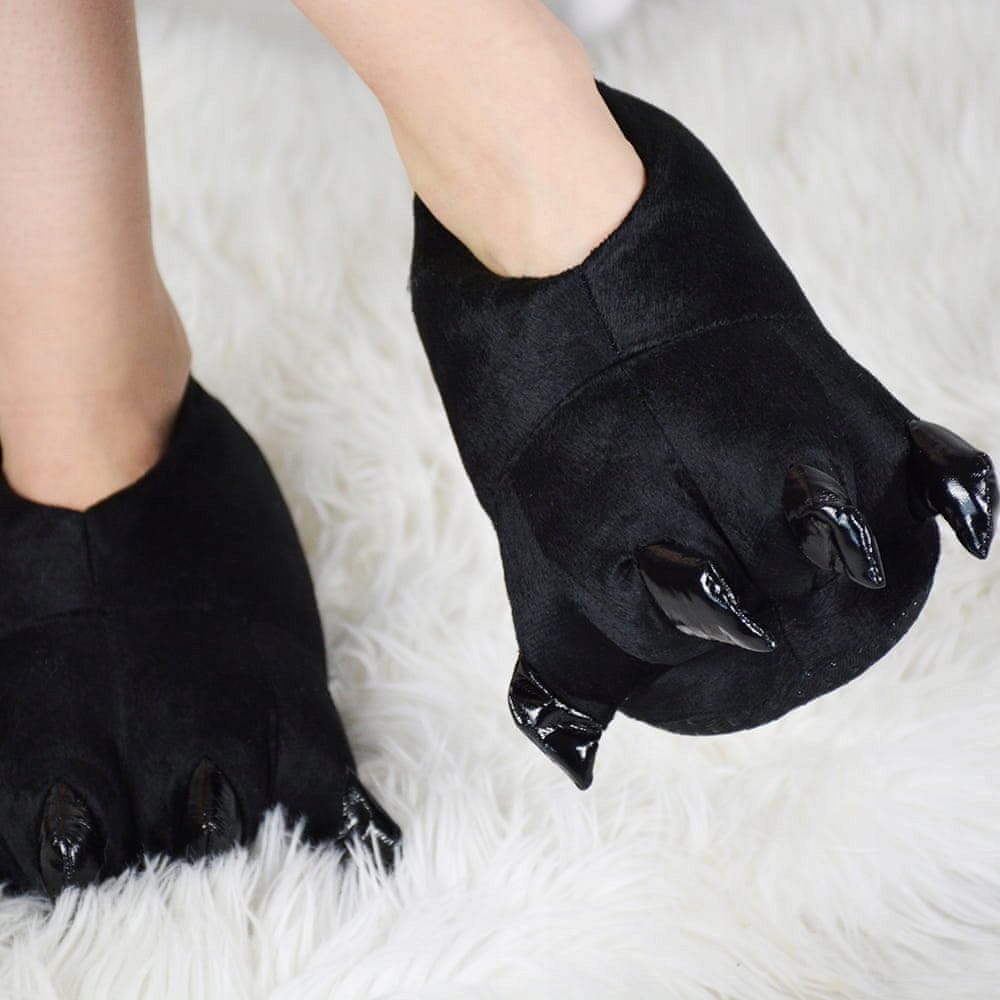 Plišasti črni copati s kremplji, idealni za hladne dni. Izdelani so iz mehke mikrovlaken in polnjeni s puhastim bombažem, zagotavljajo toplotno udobje in so udobni za nošenje. Troslojni podplat z nedrsečo plastjo zagotavlja stabilnost in varnost. Ti copati so odličen dodatek k enodelnim kostumom ali kot darilo. Na voljo v treh velikostih: S, M in L.
