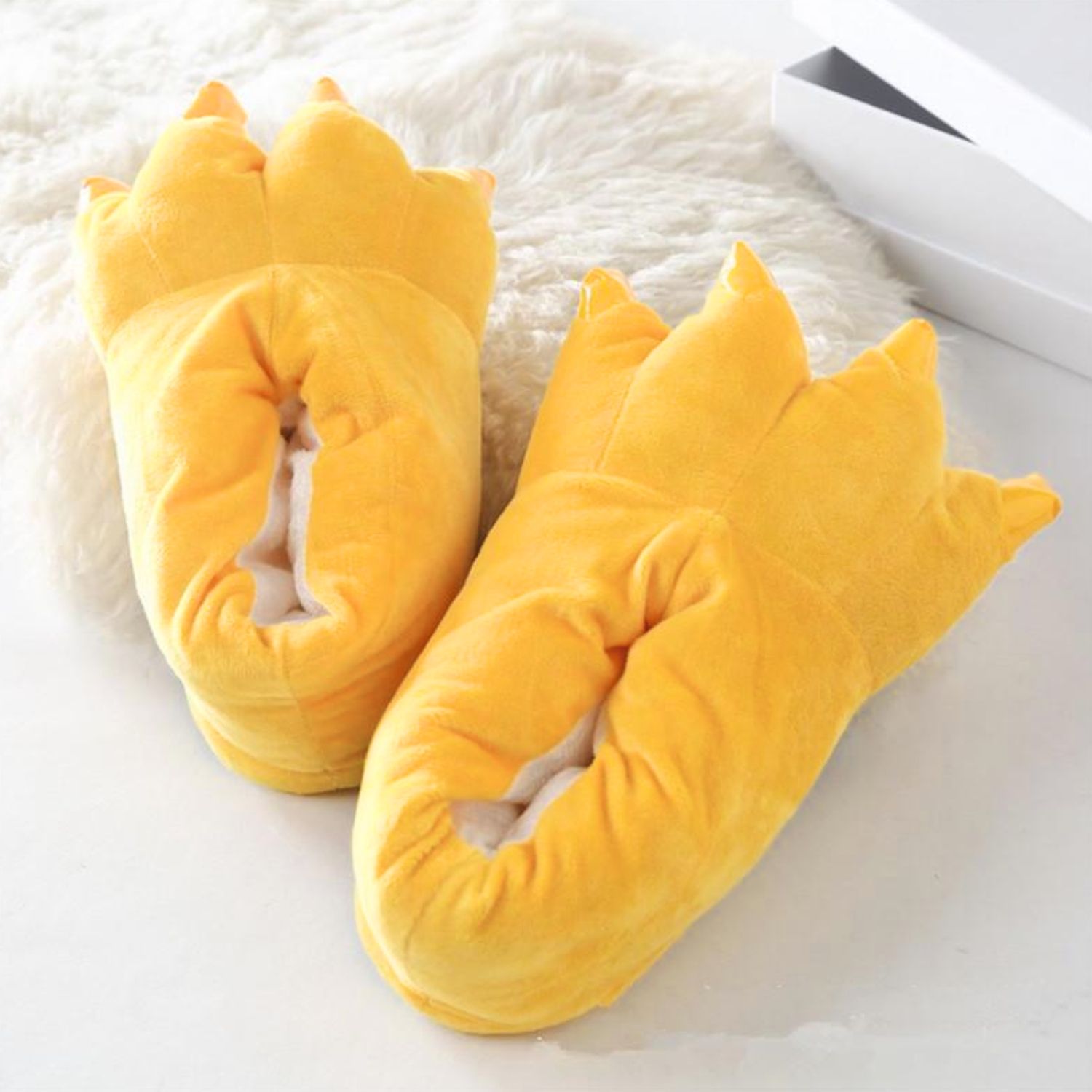 Topli, plišasti copati v obliki tačk s kremplji, izdelani iz mehke mikrovlaken in polnjeni s puhastim bombažem. Zagotavljajo udobje, toplotno izolacijo in priročnost. Troslojni podplat z nedrsečimi čepki zagotavlja stabilnost in varnost. Živahna rumena barva in značilna oblika jih naredita privlačen dodatek k enodelnim kostumom. Na voljo v treh velikostih: S, M in L. Popolni kot darilo ali element kostuma.
