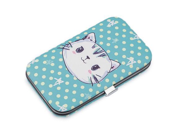 Manikura v kovčku z mačjim potiskom bo razveselila vsako žensko ali dekle. Je praktičen, udobno se prilega v torbico in je primeren tudi za potovanja. Kovček ima kakovostno kovinsko ogrodje, ki ga je mogoče odpreti preprosto s pritiskom na ročico in zapreti z zaskočitvijo. Kovček za manikuro vsebuje: škarjice za nohte, pilico za nohte, pinceto, orodje za obrezovanje nohtne kožice in 2 kosa ščipalk za nohte.