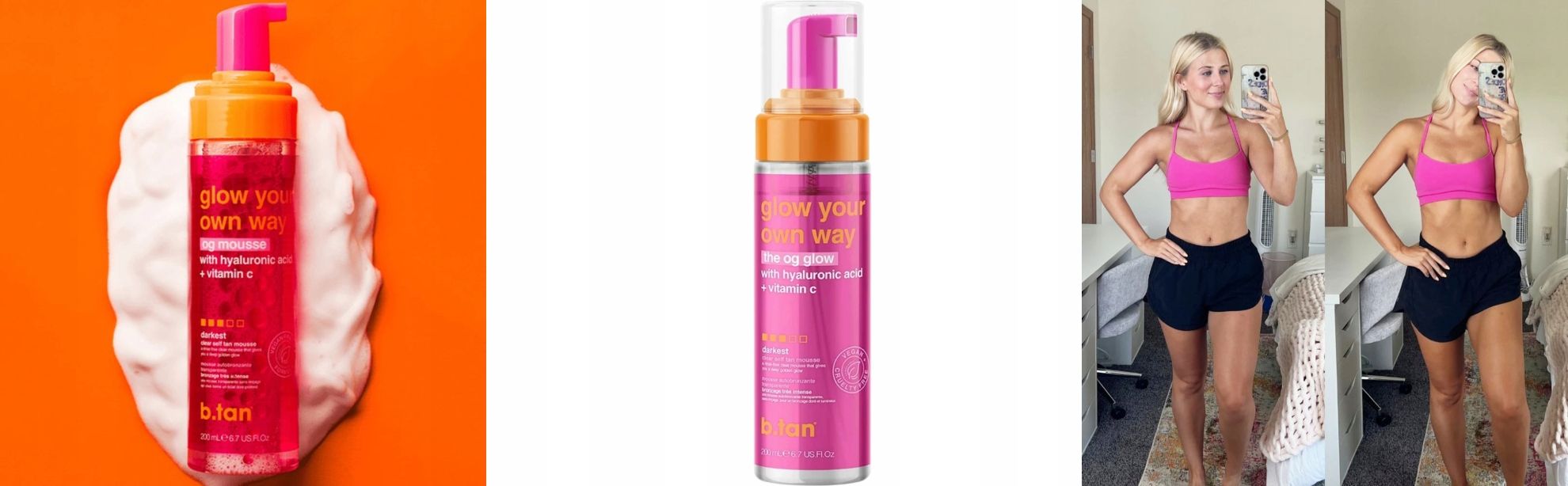 Glow Your Own Way – samoporjavitvena pena 200 ml. Naraven videz, porjavelost brez sonca. Brez oranžnih odtenkov, brez vonja po umetnem strojenju. Popoln za vsak ton kože. Želite čudovito zlato porjavelost brez tveganja UV-sevanja? Zaupajte b.tan glowu na svoj način – lahka pena za samoporjavitev, enostavna za uporabo, ki vam zagotovi zdravo in naravno porjavelost v samo 1 uri! Brez umetnih dišav, brez prog in brez oranžnih tonov. Lahka penasta formula se gladko razporedi in hitro vpije. Vsebuje naravne sestavine za porjavitev (rastlinski DHA). Brez parabenov, brez sulfatov, ni testirano na živalih. Popoln za ustvarjanje rezultatov – pustite delovati dlje za intenzivnejšo barvo. Primerno za vegane. Kako uporabiti: Pripravite kožo s pilingom. S samoporjavitveno rokavico enakomerno nanesite na suho kožo. Pustite delovati 1 do 4 ure, odvisno od želenega učinka. Izperite z mlačno vodo; ne uporabljajte mila. Porjavelost se popolnoma razvije v 24 urah. Vonj: nevtralen – brez značilnega vonja po samoporjavitvi Kapaciteta: 200 ml Proizvajalec: b.tan (Avstralija)