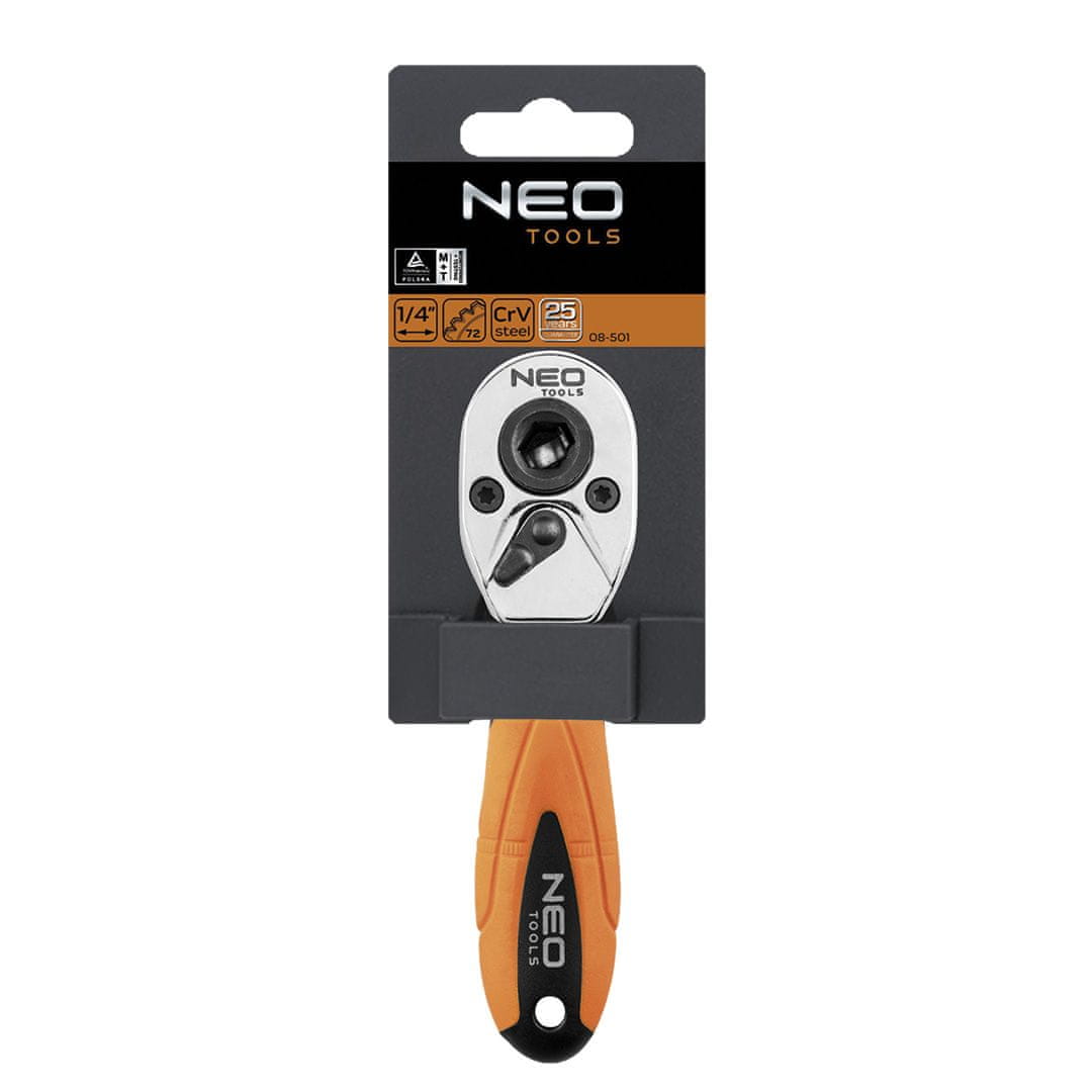 Raglja NEO 1/4" z nastavki in nastavki (ref. št. 08–501), dolga 105 mm, z ohišjem iz krom vanadijevega jekla, izdelana v skladu s standardom DIN 3122. 72-zobni mehanizem raglje omogoča natančno delovanje in je izdelan iz izjemno trpežnega krom molibdenovega jekla, kar podaljšuje življenjsko dobo orodja. Ergonomski ročaj iz dveh materialov izboljša udobje pri delu. Kakovost orodja potrjujeta certifikat TÜV in 25-letna garancija proizvajalca. Blagovna znamka NEO izpolnjuje pričakovanja profesionalcev.
