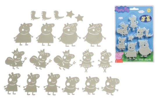 Set figuric prašička Peppe in drugih slik, ki ob osvetlitvi v temi poskrbijo za prijetnejše uspavanje manjših in večjih otrok. Lahko se nalepi na steno, strop, pohištvo itd. Vsebuje 20 kosov.