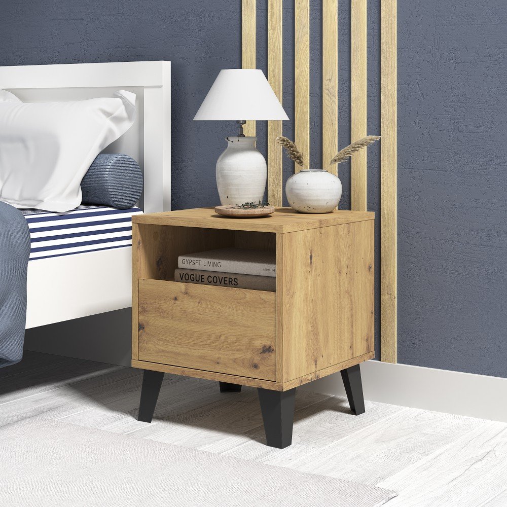 Nočna omarica BOGAN NEW 1S je stilski in praktičen dodatek za vsako spalnico, otroško ali študentsko sobo. Odlikuje jo sodoben dizajn v izvedbi hrast artisan z elegantnimi črnimi nogicami, ki ji dajejo brezčasen videz. Izdelana je iz kakovostne laminirane iverne plošče in se zaradi svojih kompaktnih dimenzij (ŠxGxV): 40×38,8×45,6 cm – zlahka prilega tudi v manjše prostore. Prostor za shranjevanje je razdeljen na dva dela: praktičen predal z dimenzijami (ŠxV): 36,2×18 cm in odprt prostor z višino 12,4 cm, kamor lahko shranite knjige, drobnarije ali dekoracije. Višina spodnjega prostora od tal je 12 cm, kar olajšuje vzdrževanje reda pod pohištvom. Bogan New 1S je idealna izbira za tiste, ki iščejo funkcionalen in hkrati estetsko dovršen kos pohištva.