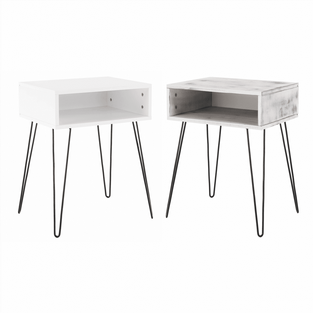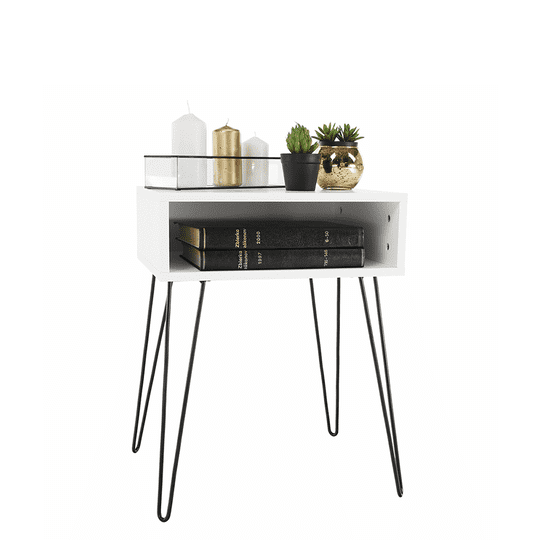 Material: matiran MDF / kovina Barva: bela / črna Dimenzije (ŠxGxV): 45×35×58 cm Odprti prostor za shranjevanje stranska mizica nočna omarica Dobavljeno v razstavljenem stanju Celoten opis