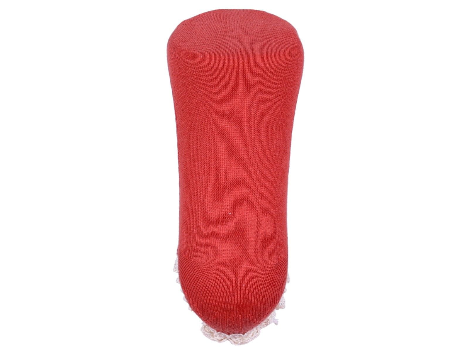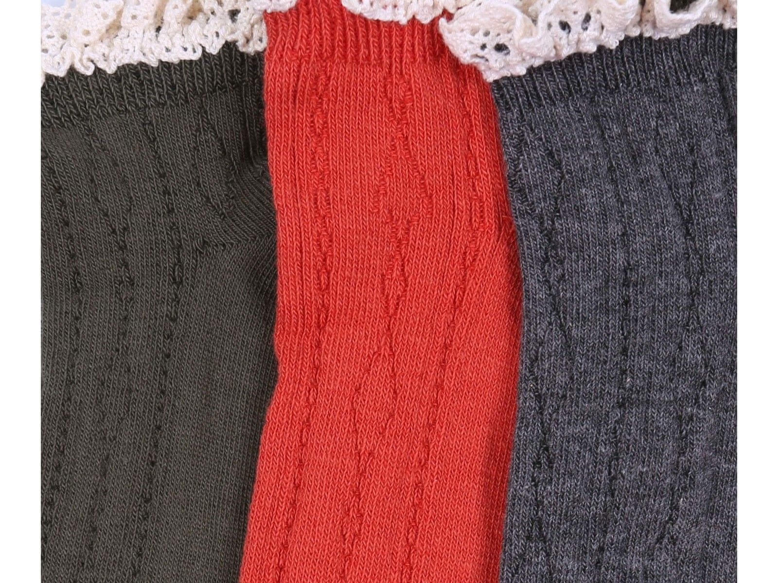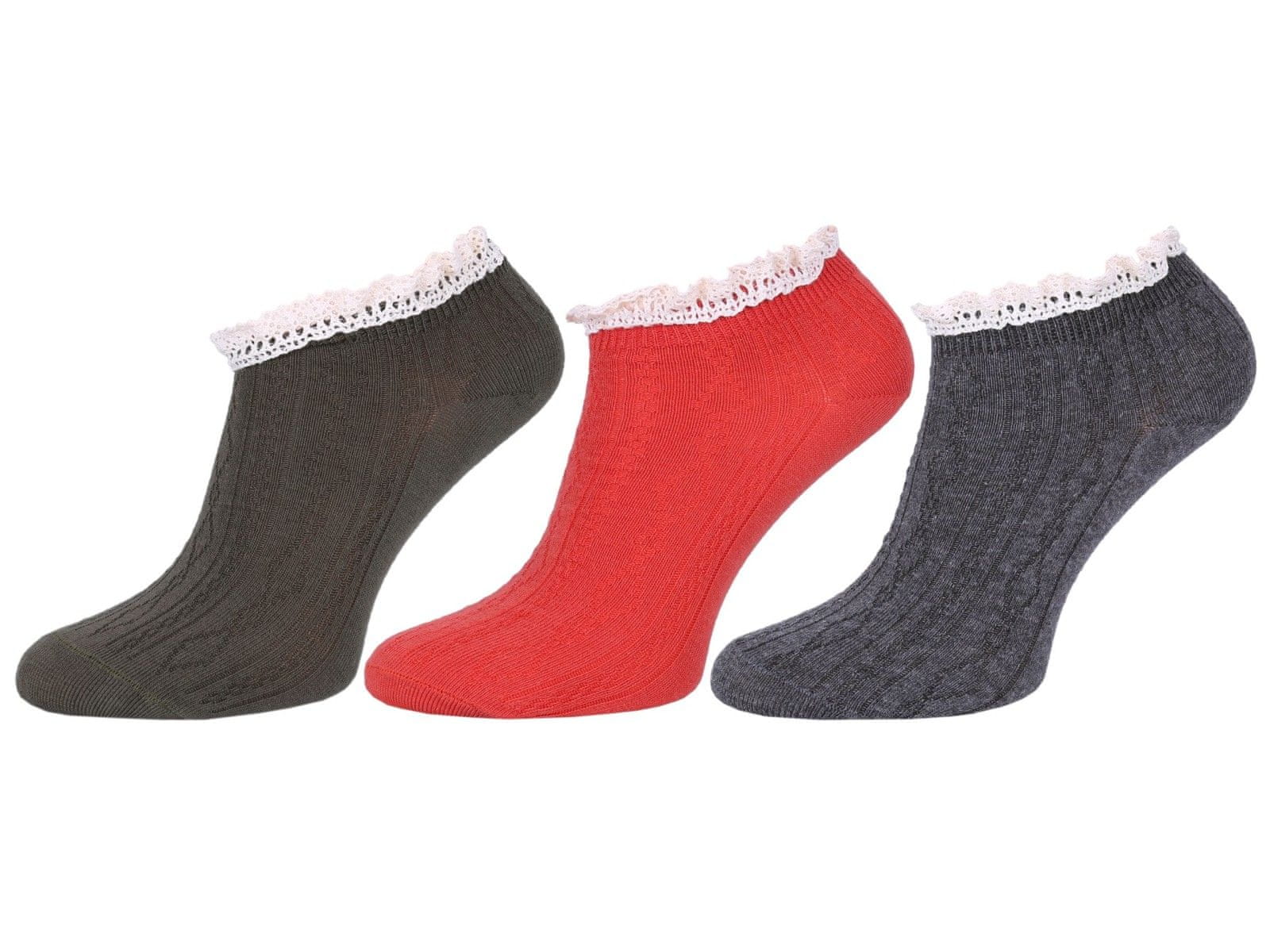 Komplet treh parov elastičnih nogavic tipa stopalke v različnih barvah.Zgornji rob je okrašen z dekorativnim čipkastim volančkom.Nogavice so v univerzalni velikosti 37–42.Izdelane so iz mehkega in prijetnega materiala na dotik. Sestava: in 2. par: 76 % bombaž, 22 % poliester, 2 % elastan par: 52 Celoten opis