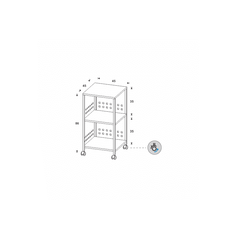 Omarica s 4-imi kolesci z zavorami, 3 police iz melamina z debelino 19 mm ter prašno lakirano kovinsko ogrodje, zapakirana v škatli skupaj z navodili za montažo.