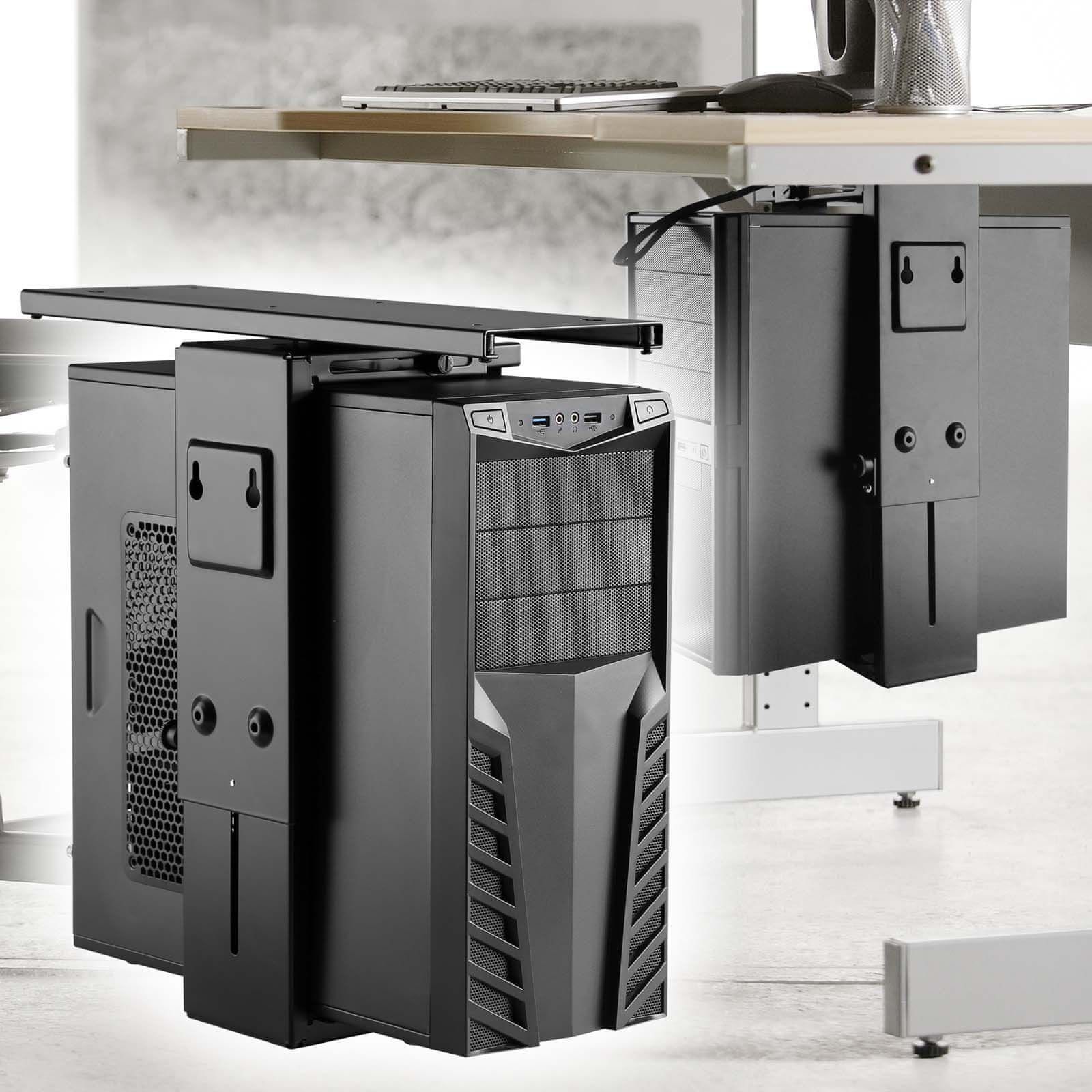 Zahvaljujoč nastavitvi višine lahko držalo za računalnik individualno prilagodite ohišju računalnika. Širina je nastavljiva tudi brez orodja. Zaradi tega je univerzalno držalo za računalnik primerno za večino osebnih računalnikov.
