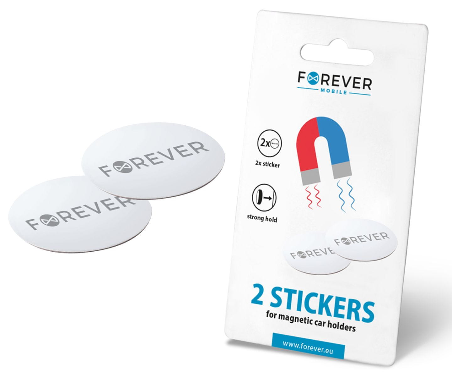 Komplet 2 magnetnih ploščic / nalepk Forever za avto nosilce uporablja magnetno ploščico / nalepko 3M in zagotavlja močno pritrjevanje telefona na avto nosilec Forever in ohranja vašo napravo varno in stabilno med vožnjo v vseh cestnih razmerah.