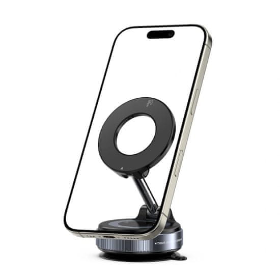 Držalo zagotavlja močan oprijem telefona zahvaljujoč vgrajenemu magnetnemu sistemu in stabilnemu prisesku, ki zagotavlja varno pritrditev na vetrobransko steklo in armaturno ploščo. Kompaktna zasnova omogoča uporabo tudi na drugih mestih – v kuhinji, kopalnici ali na prostem.