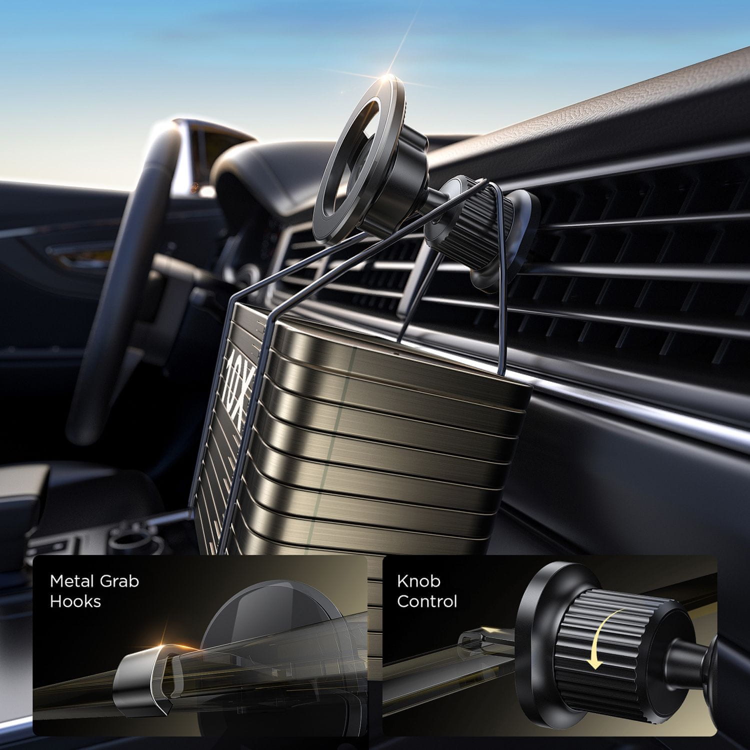 • Skladnost s ploščatimi lopaticami zračnikov: Ta nosilec je zasnovan izključno za ravne lopatice zračnikov, kar zagotavlja varno in stabilno namestitev. Ni združljiv z okroglimi ali turbinskimi zračniki. Za optimalno delovanje se pred namestitvijo prepričajte, da ima vaše vozilo ravne lopatice zračnikov.