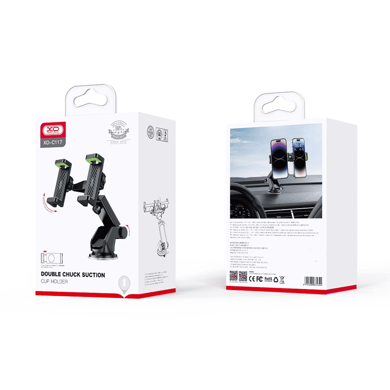 XO C117 je avto nosilec za dva pametna telefona v univerzalni različici za armaturno ploščo / avtomobilsko okno. Omogoča priročno postavitev naprave v vidnem polju in rokah voznika. Udobje pri uporabi vam omogoča, da telefon hitro odložite in vzamete ven z eno roko.