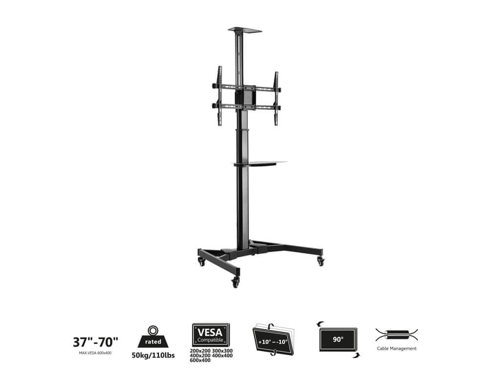 Premično stojalo za TV na koleščkih. Primerno za televizorje od 37" do 70". Ima polico za multimedijo ali kamero. Enostavno prilagodljiva višina in integriran kanal za kable. Celoten opis