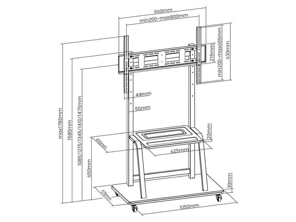 Premično stojalo za TV na koleščkih. Primerno za televizorje od 37" do 100". Ima polico za multimedijo ali kamero. Omogoča nastavitev višine TV-ja na 1085 mm, 1215 mm, 1345 mm ali 1410 mm. Celoten opis