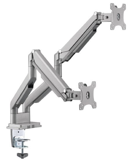 Nagibni vrtljivi nosilec je odlična rešitev za 2 monitorja z diagonalo 17"-32". Zaradi zasnove iz aluminijastega jekla je nosilec zelo trpežen in zlahka zadrži do 9 kg tovora na eni roki. Zagotovo vam bo dobrodošla možnost vrtenja držala v vodoravni smeri za +/-90° in navpični smeri za +/-90° ter okoli lastne osi za +/-90° (pivot).