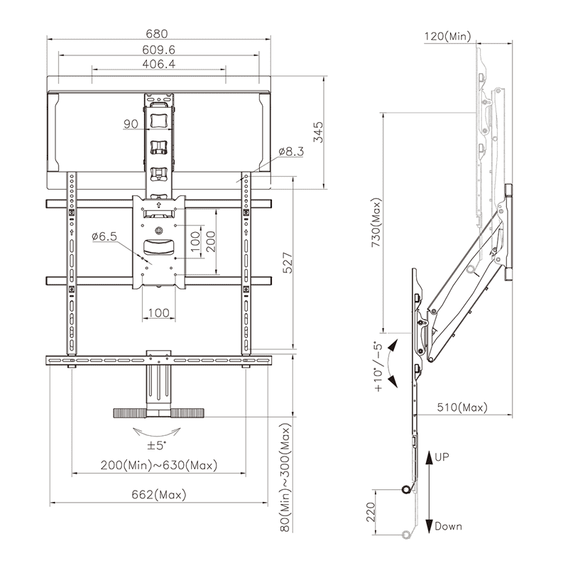• Zaslon vodoravno nastavljiv: +/- 5°