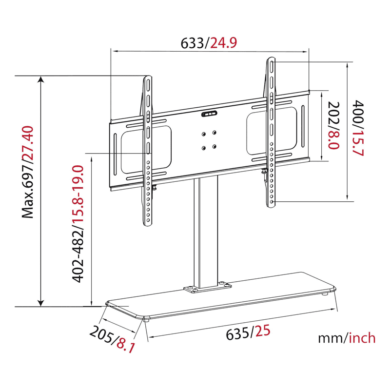 • Osnovna plošča: 635 × 205 mm, izdelana iz 8 mm varnostnega stekla