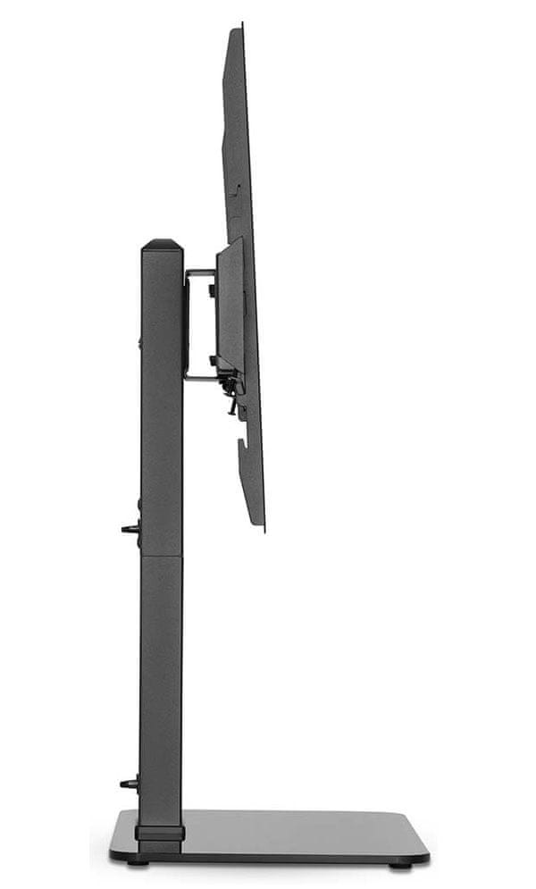 Mizno stojalo z nastavljivo višino je primerno za televizorje z diagonalo od 37" do 70". Ponuja navpično nastavitev višine v treh položajih in obračanje od –35° do +35° za popoln kot gledanja od koder koli v prostoru. Osnova iz kaljenega stekla debeline 8 mm zagotavlja trdno in zanesljivo podporo. Seveda je vgrajen tudi sistem za upravljanje kablov.