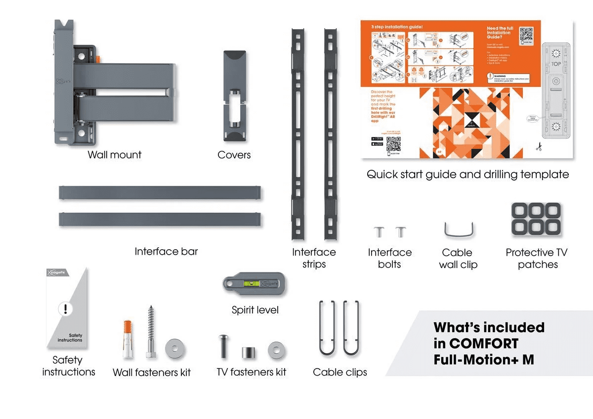 COMFORT Full-Motion+ nosilec lahko enostavno namestite sami. V paketu so predloga za vrtanje, vijaki, Fischer® DuoPower tiplci, sponke za kable in libela. Prvo luknjo označite z brezplačno aplikacijo DrillRight. Navodila so v Quick Installation Guide, podroben priročnik in video pa so na voljo online.