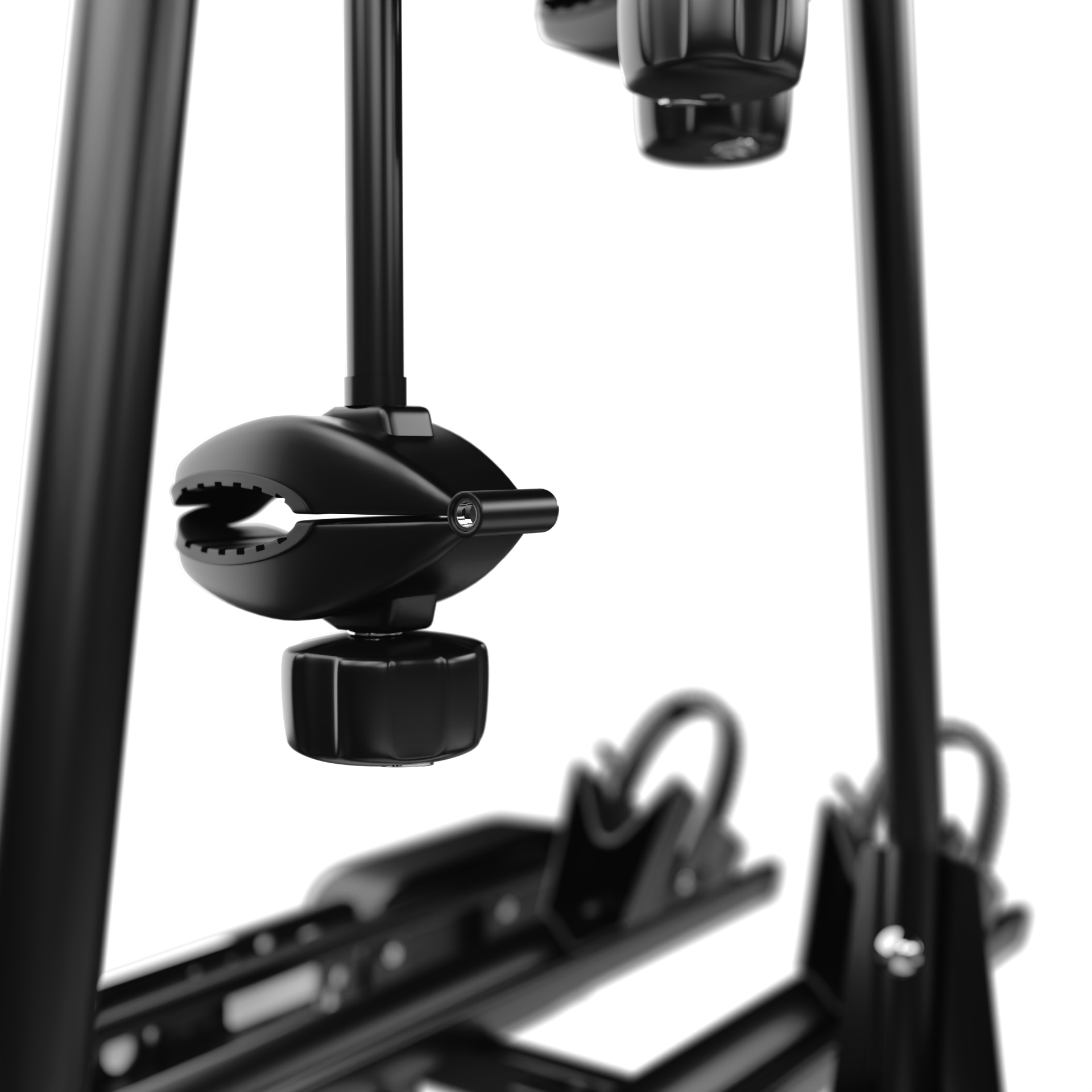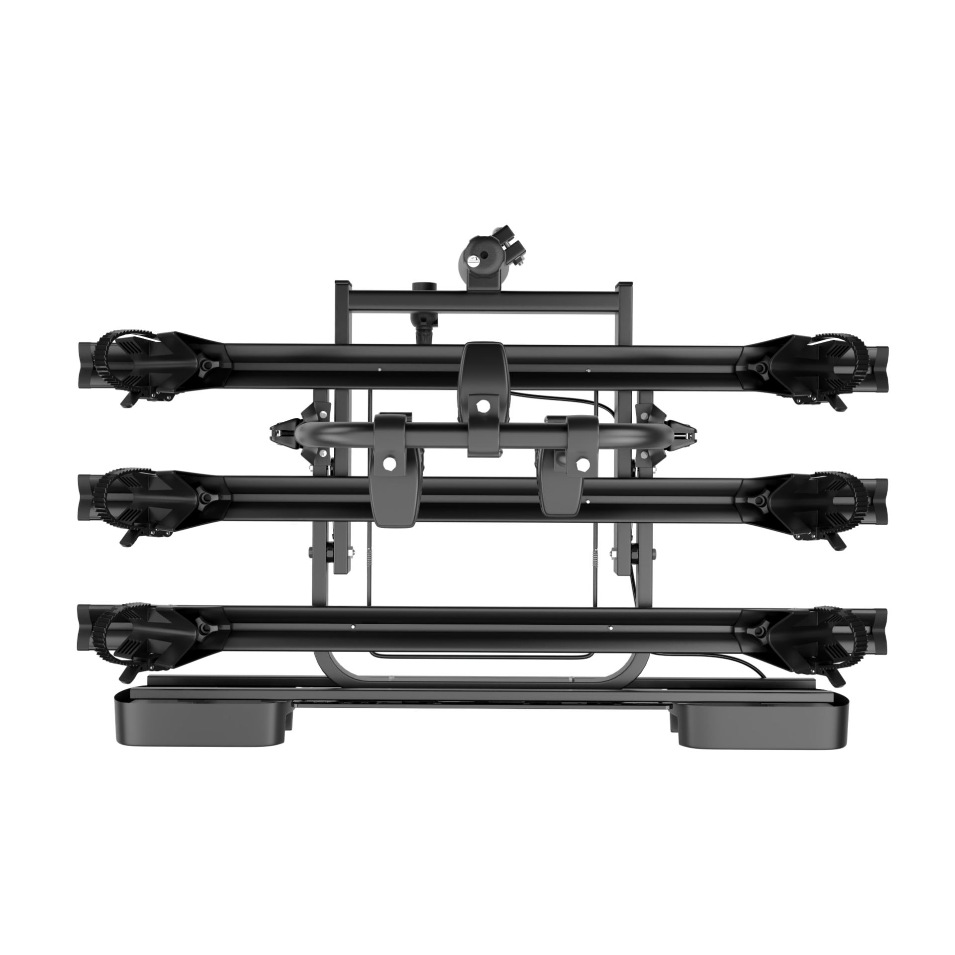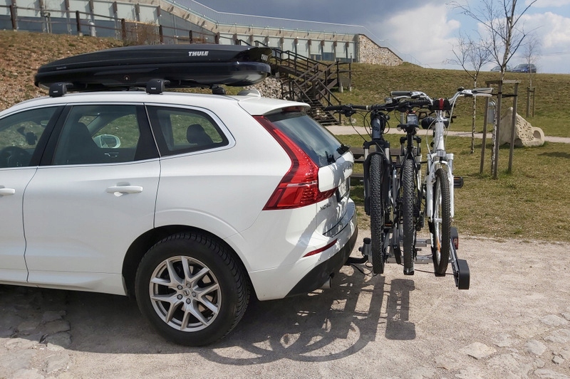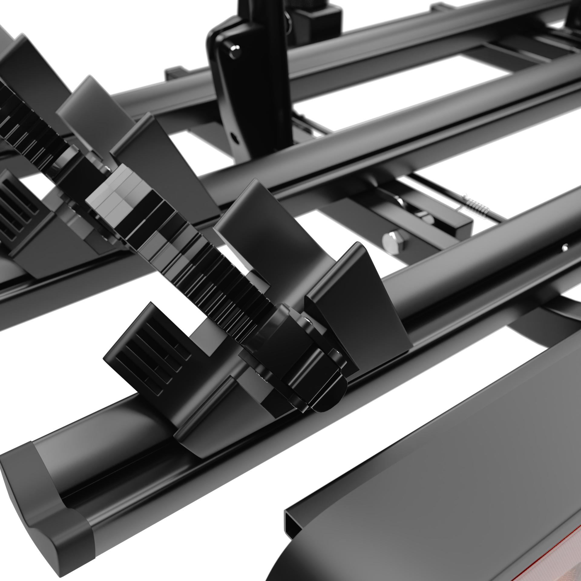 zložljiva funkcija ročaja. Zahvaljujoč tej platformi, ki prihrani prostor, ga je mogoče shraniti v večino prtljažnikov avtomobilov. Široki nosilci koles z močnimi trakovi, katerih razmik je mogoče nastaviti. Omogočajo