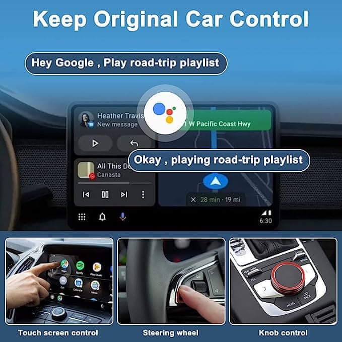 Enostavna Vožnja: Ta brezžični Android Auto-adapter ohranja originalno kakovost zvoka vašega avtomobila in originalne načine upravljanja, kot so zaslon na dotik, gumbi in volan. S sinhronizacijo aplikacij iz telefona na zaslon avtomobila, kot so Spotify, Waze, Whatsapp, glasovno upravljanje, Google-assistent, GPS-navigacija, klicanje in sporočila, vožnja postane pametnejša in prijetnejša.