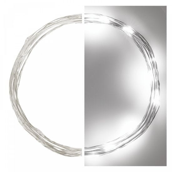 Moderna nano veriga za božično osvetljavo v obliki srebrne žice je odličen dodatek za praznično okraševanje doma. Veriga je zaradi stopnje zaščite IP20 primerna le za notranjo uporabo, za delovanje pa potrebuje 2 bateriji tipa AA. Dolga je 1,9 m, na njej pa je 20 majhnih LED lučk, ki osvetlijo prostor v hladno beli svetlobi, zaradi auto on/off časovnika pa lahko nastavite čas delovanja, tako da vas ne bo skrbelo, da ste jih pozabili izklopiti.