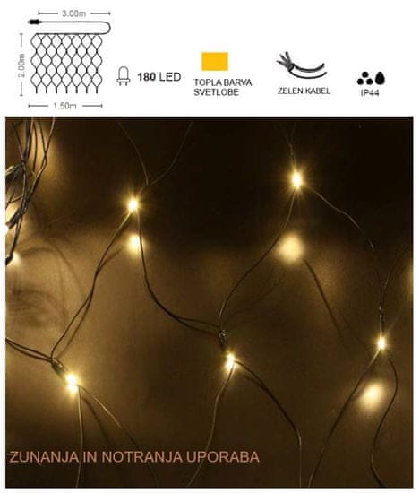 Elegantna LED mrežna svetlobna dekoracija, idealna za ustvarjanje tople praznične ali ambientalne osvetlitve. Zaradi IP44 zaščite je primerna tako za notranjo kot zunanjo uporabo, prožen zeleni kabel pa se lepo zlije z naravnimi površinami, kot so žive meje, ograje ali božične smrečice.
