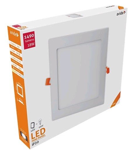 Moč: 18 W<br> Vgrajen vir svetlobe: SMD2835 LED<br> Svetilnost: 1490 lumnov<br> Barvna temperatura: 4000 K<br> Kot osvetlitve: 120°<br>Velikost: 220 × 220 × 10 mm<br>Globina: 8 mm<br>Vgradnji del: 201 mm<br> Življenjska doba: 25 000 ur<br> Napetost: AC 220 – 240V<br> Energijska razred: G<br> Delovna temperatura: –20°C do +40°C<br> CRI: &gt; 80<br> Barva izdelka: bela<br> Material: aluminij, PMMA<br> Zaščita: IP 20