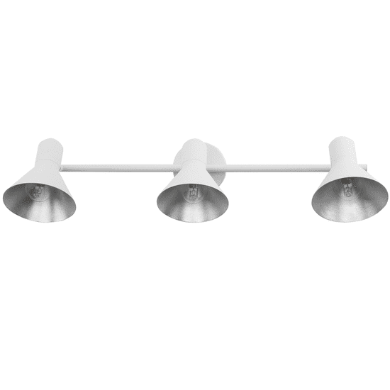 Bela stenska svetilka s tremi svetlobnimi točkami je idealna za branje ali dodatno osvetlitev prostora. Ta svetilka s stožčastimi senčili vnaša več svetlobe (ker se svetloba širi pod večjim kotom) in se odlično ujema z industrijskimi ali sodobnimi notranjimi prostori. Srebrna obloga v notranjosti senčila je ročno izdelana, zato se lahko vsaka svetilka razlikuje od prikazane. Svetilko lahko obesite na steno ali strop. Primerno za žarnice E14 z največjo močjo 25 W. Žarnice niso vključene v ponudbo.