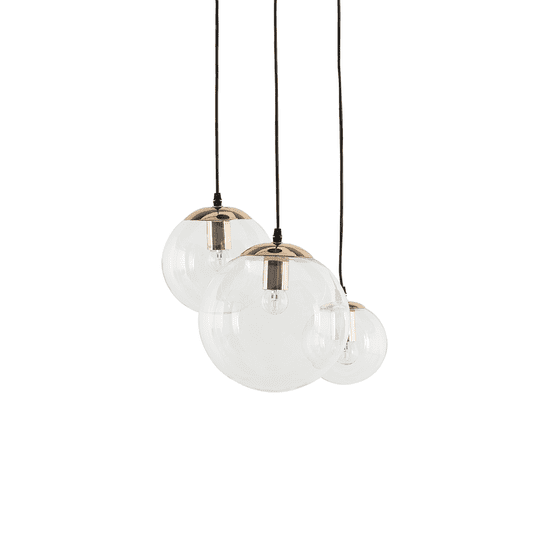 Predstavljena svetilka navdušuje z izjemno eleganco in izvirnim videzom. Trije sferični odtenki so različno veliki in obešeni na različnih višinah. Svetilka bo v vaš prostor vnesla odlično razpoloženje. Nosilec je izdelan iz kovine zlate barve, zaradi česar je svetilka videti zelo estetsko.