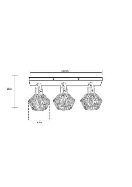 Stropna SPOT svetilka Globo VALLI 54043–3 iz kovine v imitacji lesa ter tremi senčili iz vrvi in navojem E27. Celoten opis