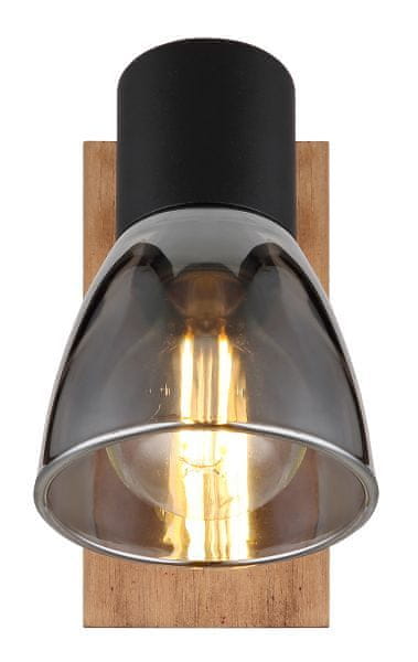 Zidna SPOT svetilka Globo CLAUDE 54307–1W iz kovine in stekla v črni barvi, z okrasno leseno ploščo ter gibljivim reflektorjem. Celoten opis