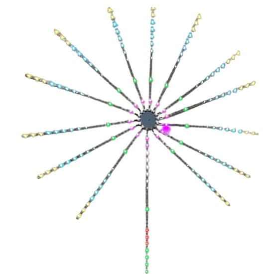 Razporeditev, ki spominja na ognjemet, je sestavljena iz 11 kratkih žarkov in enega podaljšanega žarka, po katerem prehajajo odtenki. Čez teh 11 trakov boste našli impresivno število 195 živahnih LED luči, ki se odzivajo na melodijo in zvok. Poleg tega lahko prek aplikacije in daljinskega upravljalnika osebno izberete glasbo, natančno nastavite paleto do 16 milijonov odtenkov in določite časovnik, kdaj se utripajoča osvetlitev ustavi.
