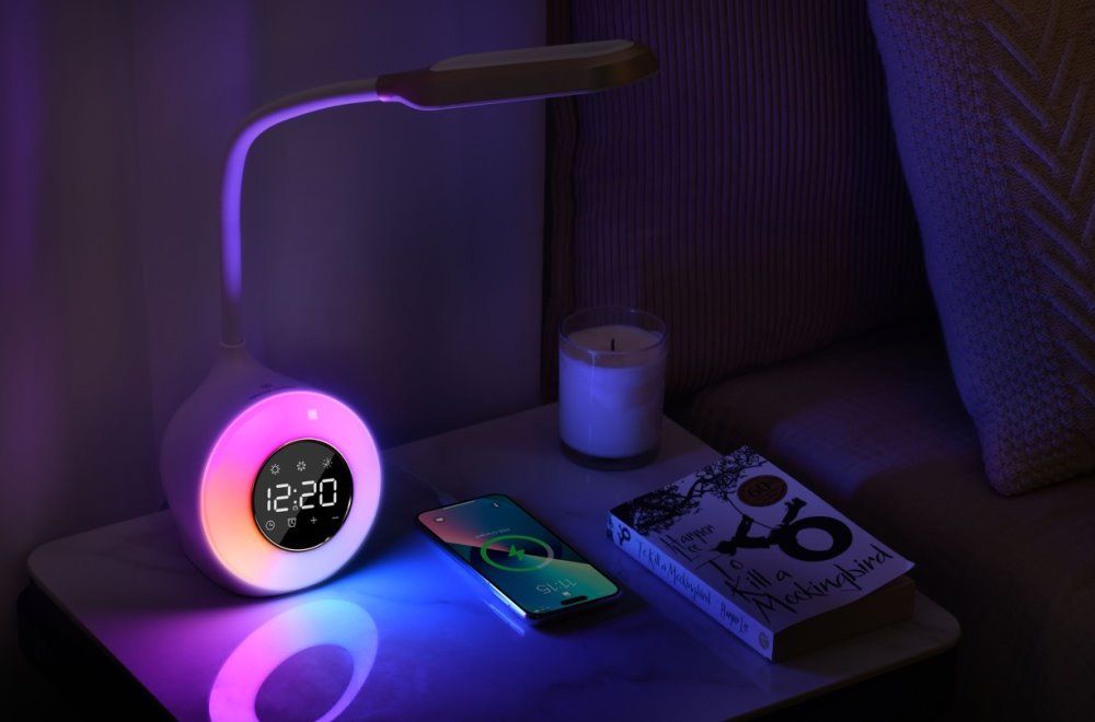 Mizna svetilka LED v sodobnem dizajnu s praktičnim digitalnim zaslonom in spektakularno nočno lučjo RGB. Odlikujejo jo nagibna roka, naravno belo senčilo na glavni luči in tristopenjska zatemnitev na dotik. Na voljo je tudi funkcija budilke z izbiro 8 zvokov. Njena prednost je tudi do 80-odstotni prihranek energije v primerjavi z običajnimi svetilkami.